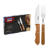 This set is made of stainless steel with longer cutting edge durability due to heat treatment. The fork prongs have more thickness and a steel stamping that ensures greater durability, preventing deformations. The set has natural wooden handles with aluminum rivets.